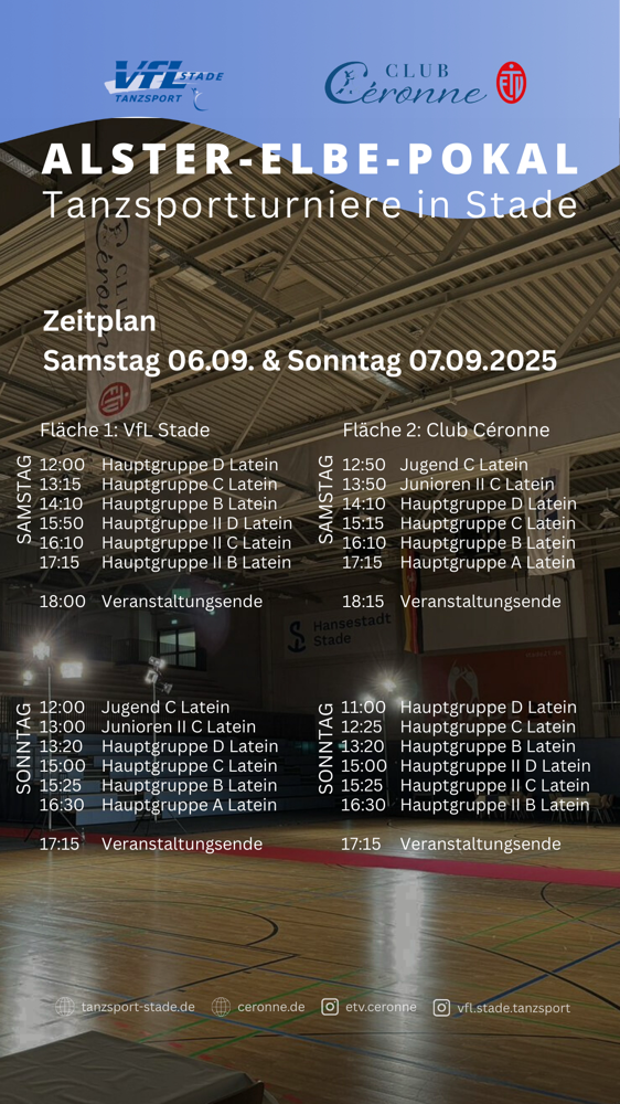 Nach der tollen Premiere im vergangenen Jahr, richten wir auch 2025 gemeinsam mit dem Club Cèronne aus Hamburg den Alster-Elbe-Pokal im Sportcampus Stade aus. Dieses Einzeltanzsportturnier wird wieder ein Highlight für alle Teilnehmenden werden.
